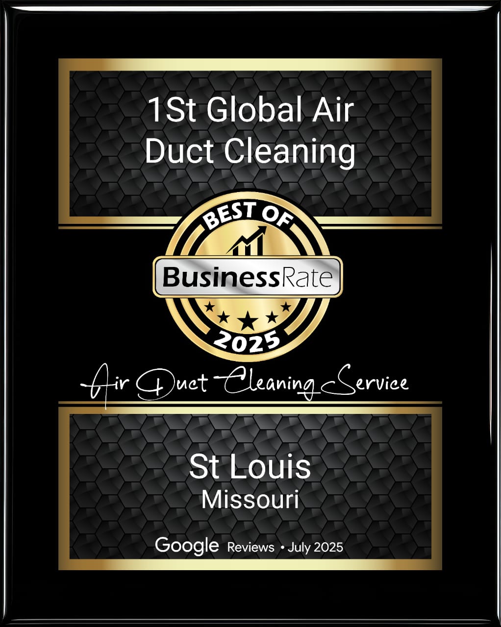 Proudly recognized as a Best of BusinessRate 2025 winner, 1st Global Air Duct Cleaning delivers trusted, high-quality air duct cleaning services in St Louis, Missouri, backed by positive Google reviews and customer satisfaction.